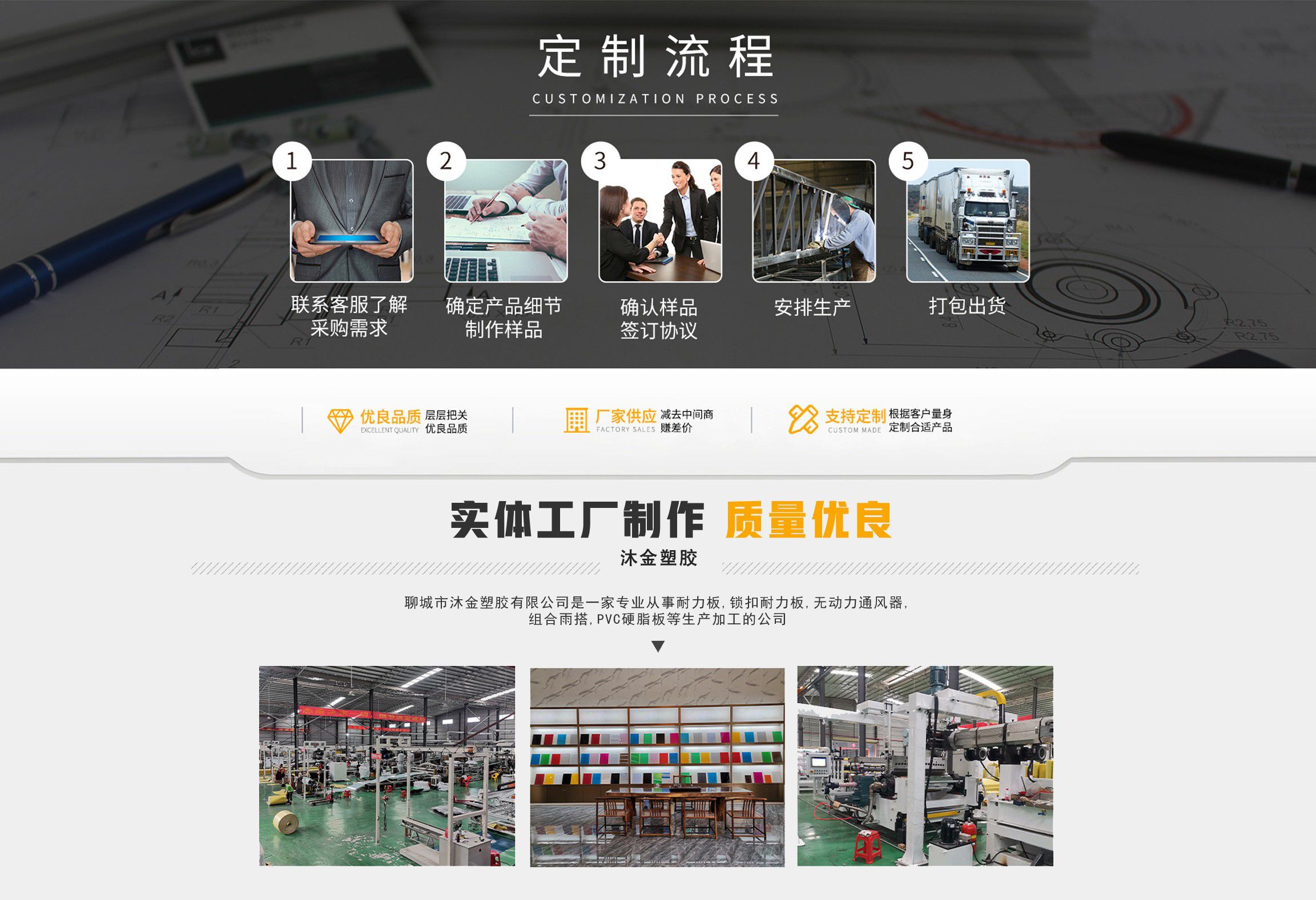 聊城市沐金塑膠有限公司注冊資金2180萬元,占地20000余平方,擁有自建廠房15000平方,員工100余名。10余年來,公司主營耐力板,鎖扣耐力板,耐力板深加工,無動力通風器,組合雨搭,PVC硬脂板,耐力板廠家等板材的發展戰略,逐漸成長為綜合性企業。  公司擁有多條板材共擠生產線,采用世界知名品牌進口原材料和先進工藝,依據完善的ISO9001質量管理體系和ISO14001環境管理體系,為產品的卓越品質提供了強有力的保證。憑借過硬的創新能力和堅實的硬件基礎,贏創已成為國內領先的熱塑性板材生產商,產品被廣泛應用于建筑業、農業、工業、廣告業、安防行業及DIY領域?! 」臼冀K致力于通過提供最優的板材應用解決方案,為客戶創造最高的價值;堅守創新、質量、靈活、服務和速度的核心價值觀;堅持“完美的產品需要完美服務的支持”的經營理念,努力實現成為世界領先的板材與解決方案供應商的夢想?! ≡谖磥恚緦⒘⒆憧蛻粜枨?,不斷改變和完善現有產品,拓展產品線和充分開發板材的應用領域,為客戶創造全方位的價值。同時更好地實現員工的價值,實現公司團隊的價值。我們將與您一起創贏未來!  企業使命:成為世界領先的板材與解決方案供應商?! 」驹妇埃和ㄟ^提供最優的板材應用解決方案,為客戶創造最高的價值?! 『诵膬r值觀:質量...